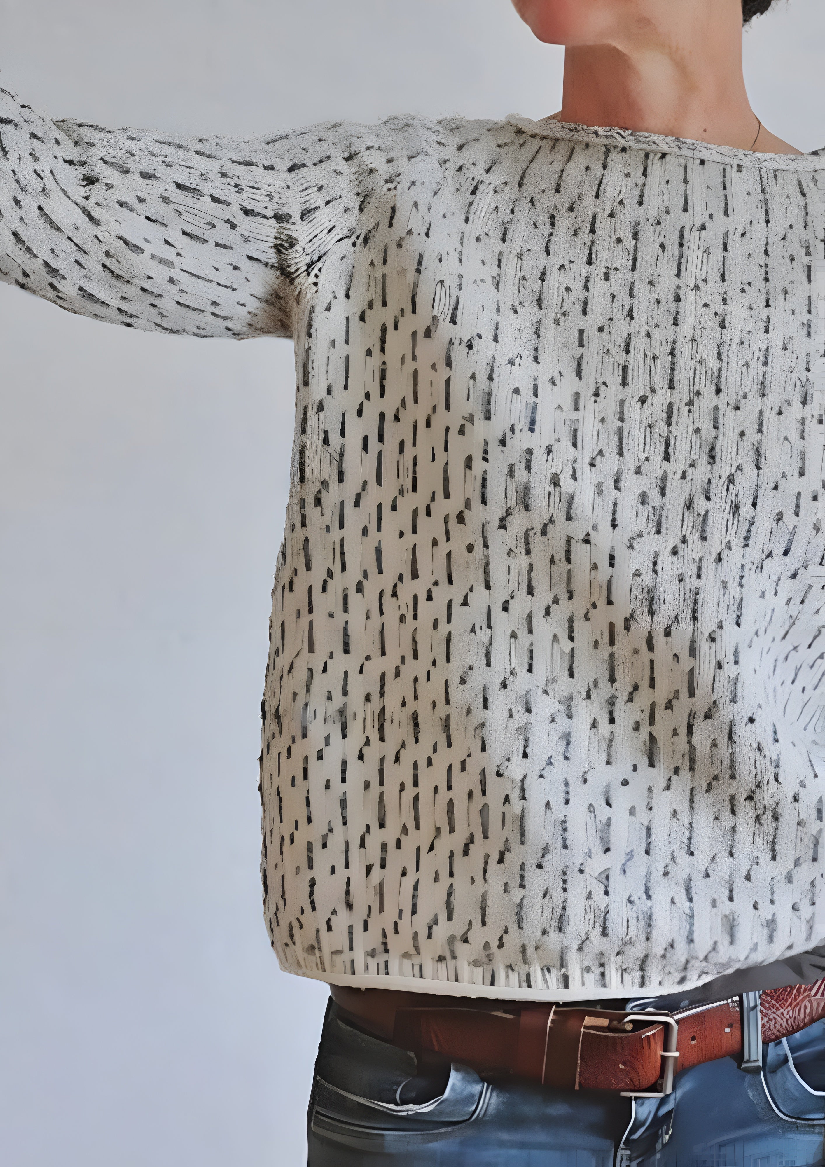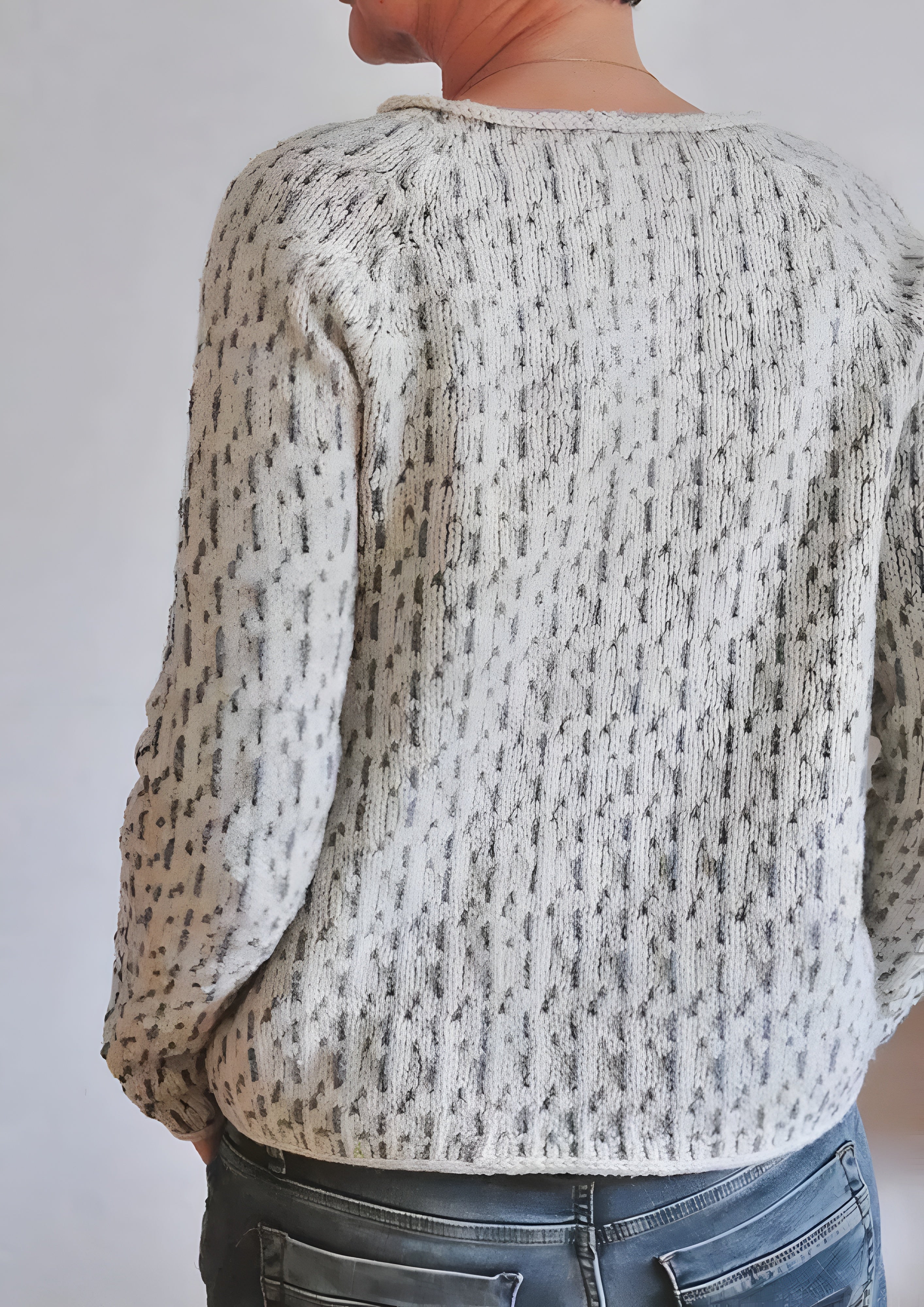 This long-sleeved top features a unique speckled pattern that adds visual depth and character to your seasonal wardrobe. The relaxed silhouette and rolled neckline create a laid-back look that remains polished for any daytime outing.