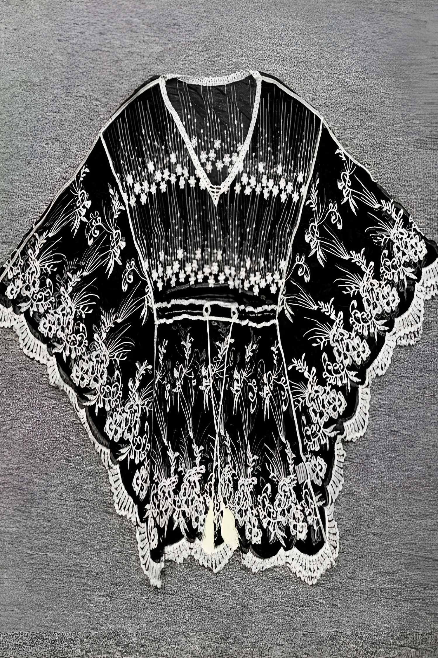 This lightweight garment features intricate floral embroidery across a transparent mesh base. Designed with a cinched drawstring waist and wide bell sleeves, it provides a structured yet flowing silhouette for sun-filled days.