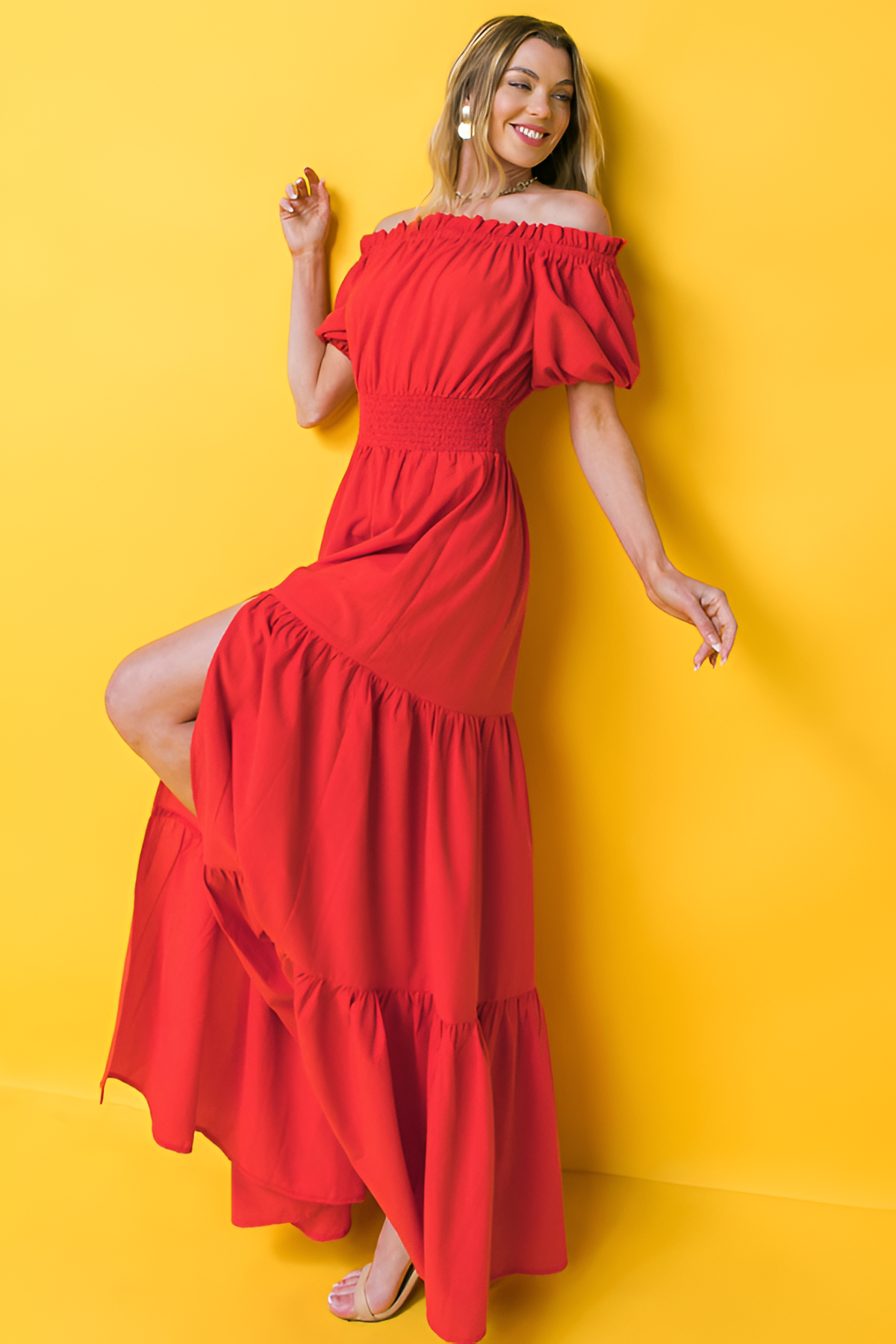 This floor-length garment features a ruffled neckline that rests across the shoulders and a smocked waistline for a defined silhouette. The tiered skirt adds movement to every step, while the high slit provides a modern detail for outdoor gatherings or weekend trips.