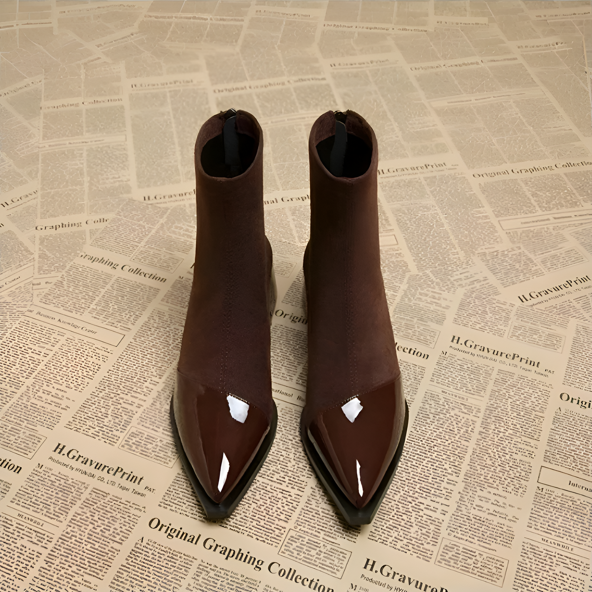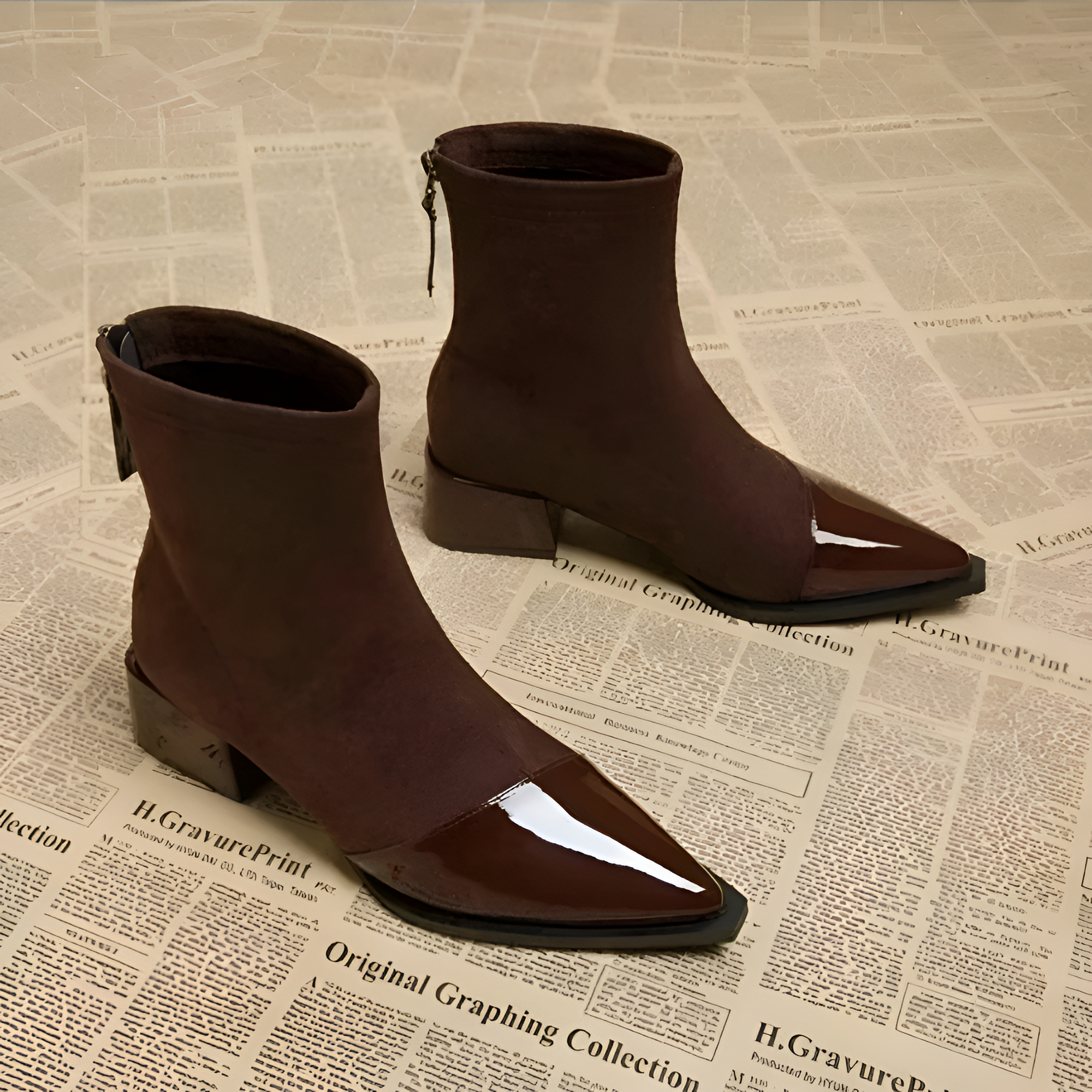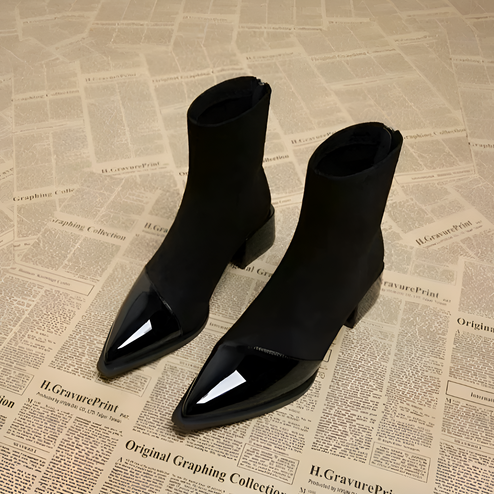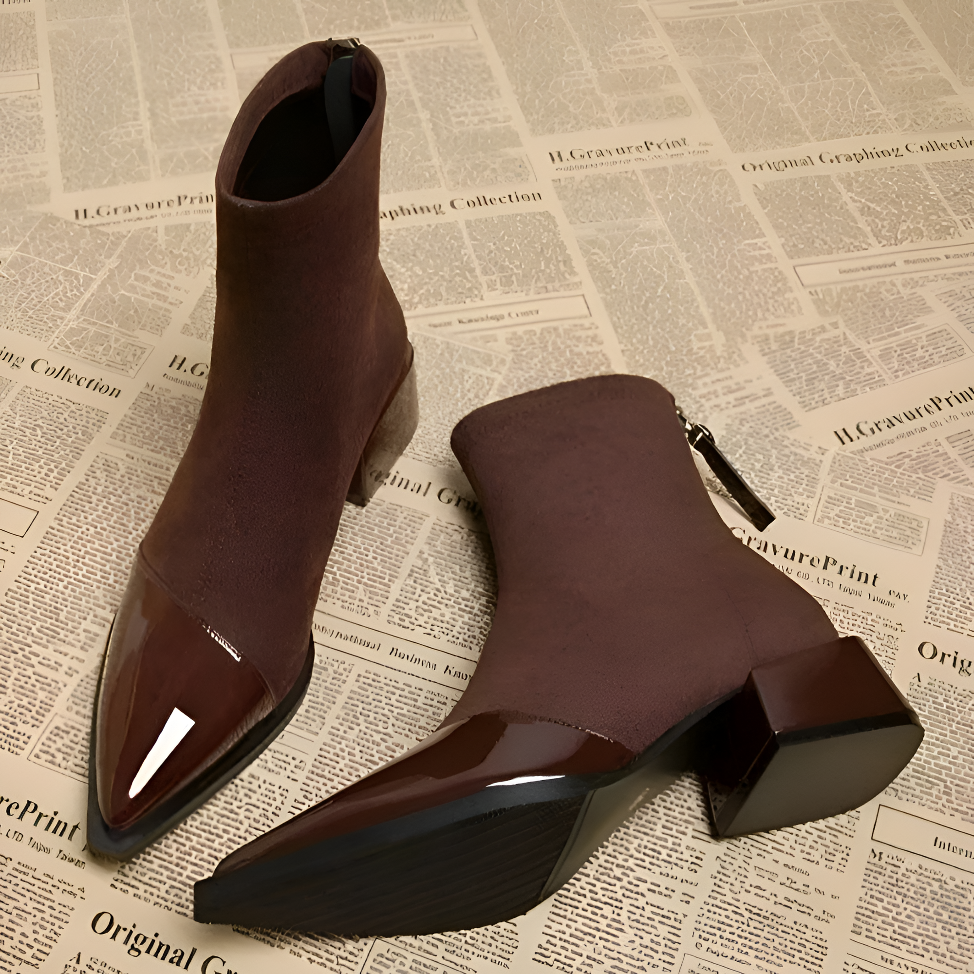 These boots feature a striking contrast between a matte shaft and a polished, reflective toe cap. Designed with a convenient back zipper and a stable mid-height heel, they provide a streamlined silhouette for various settings.